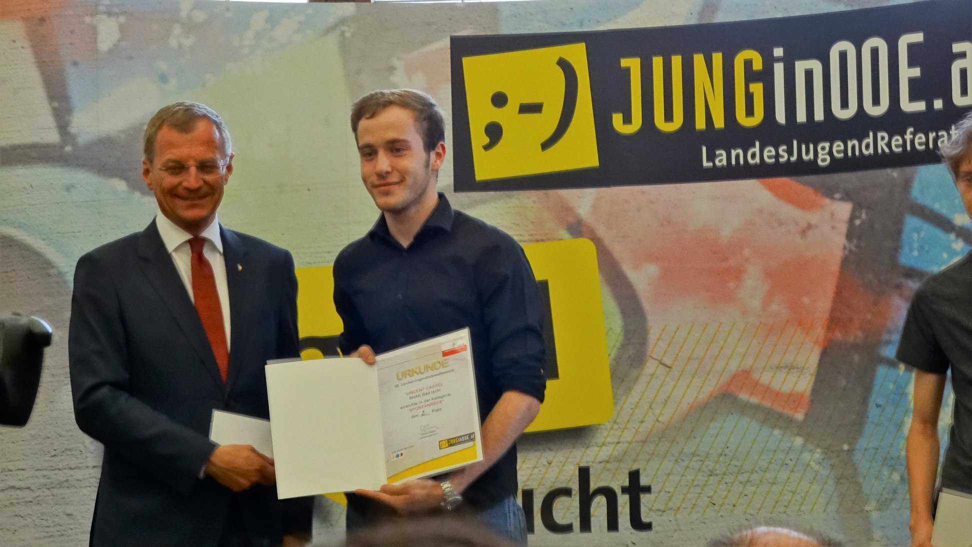 2. Platz für Vincent beim Redewettbewerb in Linz! In der Kategorie „Spontanrede“ entschied er sich für das Thema „Politik und Gesellschaft“ zu den Schlagworten „Vereinigte Staaten Europas – Traum oder Alptraum?“ Fünf Minuten Zeit, um sich für seine Rede vorzubereiten? Kein Problem! Vincent überzeugte die dreiköpfige Jury im ehrwürdigen Steinernen Saal des Landhauses und Landeshauptmann Mag. Thomas Stelzer überreichte die Preise. Wir gratulieren!